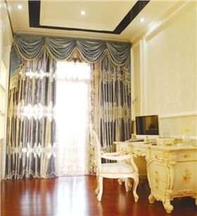 在歐式風(fēng)格的設(shè)計(jì)中,歐陸情韻的窗簾時必不可少的裝飾之一,華麗的提花映襯在湖藍(lán)色的窗簾上栩栩生輝,波浪簾頭優(yōu)雅富麗。整體色彩與鑲金的寶藍(lán)色布藝沙發(fā)相互照應(yīng),明艷高貴。