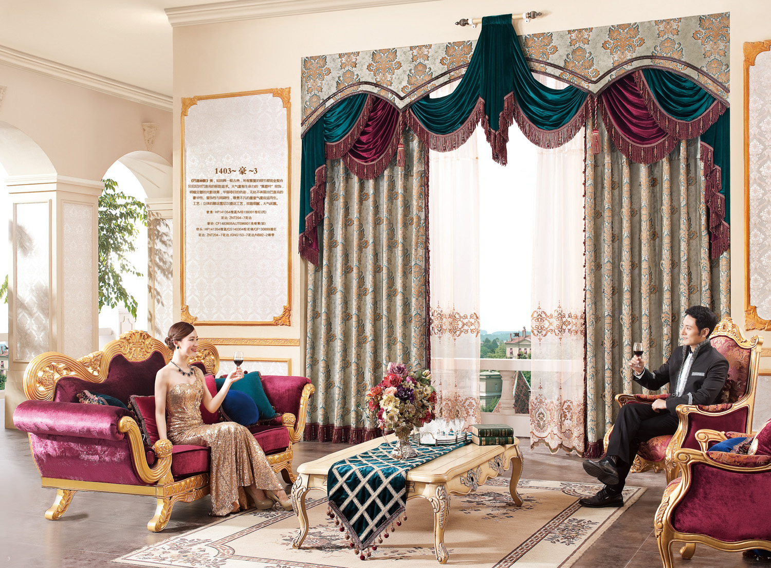 花型、色彩及款式:融合各種歐式花卉及卷草圖案。以金色調(diào)為主,酒紅、紫紅等為配色,搭配層次豐富的水波簾頭款式及歐式花邊進(jìn)行設(shè)計。(如:吊珠類花邊等)