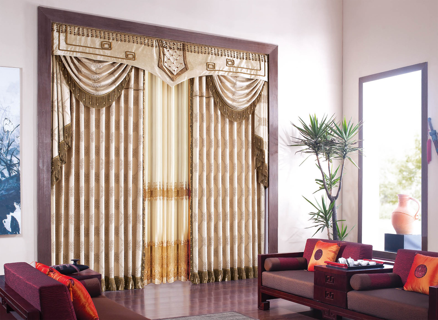 花型、色彩及款式:花型上采用中國(guó)傳統(tǒng)的圖案(如:和氏壁、祥云、圍棋等),體現(xiàn)中國(guó)美學(xué);以棕色調(diào)、米色調(diào)為主,款式可采用直線(xiàn)造型的平過(guò)簾頭、水波簾頭或二者相結(jié)合的形式。