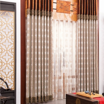 花型、色彩及款式:花型上采用中國傳統(tǒng)的圖案(如:和氏壁、祥云、圍棋等),體現(xiàn)中國美學(xué);以棕色調(diào)、米色調(diào)為主,款式可采用直線造型的平過簾頭、水波簾頭或二者相結(jié)合的形式。